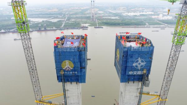 5月26日上午,南京仙新路长江大桥南北主塔顺利封顶。